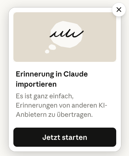 Bevor du irgendetwas anderes tust: Exportiere alles, was ChatGPT über dich weiß. Der direkteste Weg: Anthropic hat (schlau, wie es ist!) eine eigene Import-Seite gebaut – du findest sie hier: claude.com/import-memory. Vermutlich siehst du auch dieses Popup in deinem Claude-Account, wenn du schon einen hast: